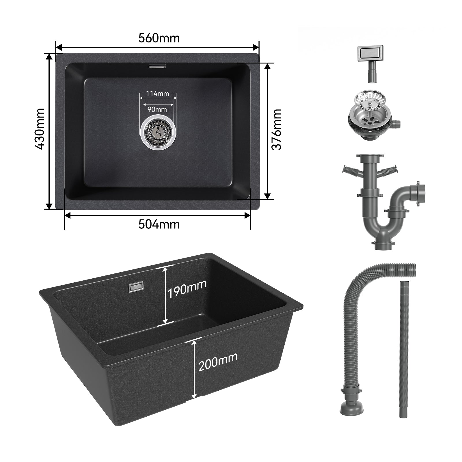 HOROW A02R-S5643B Granitspüle Schwarz 56×43 cm, Kratzfest, eckig, pflegeleicht
