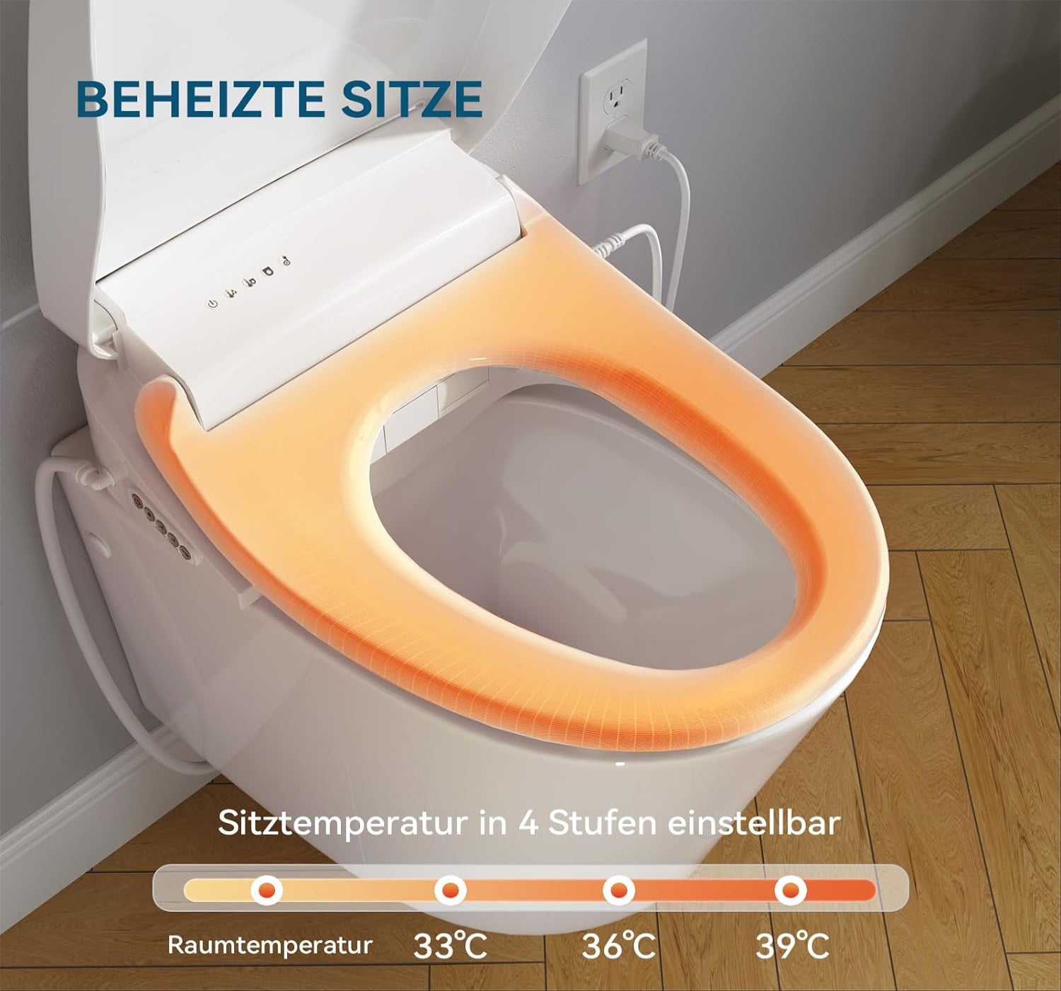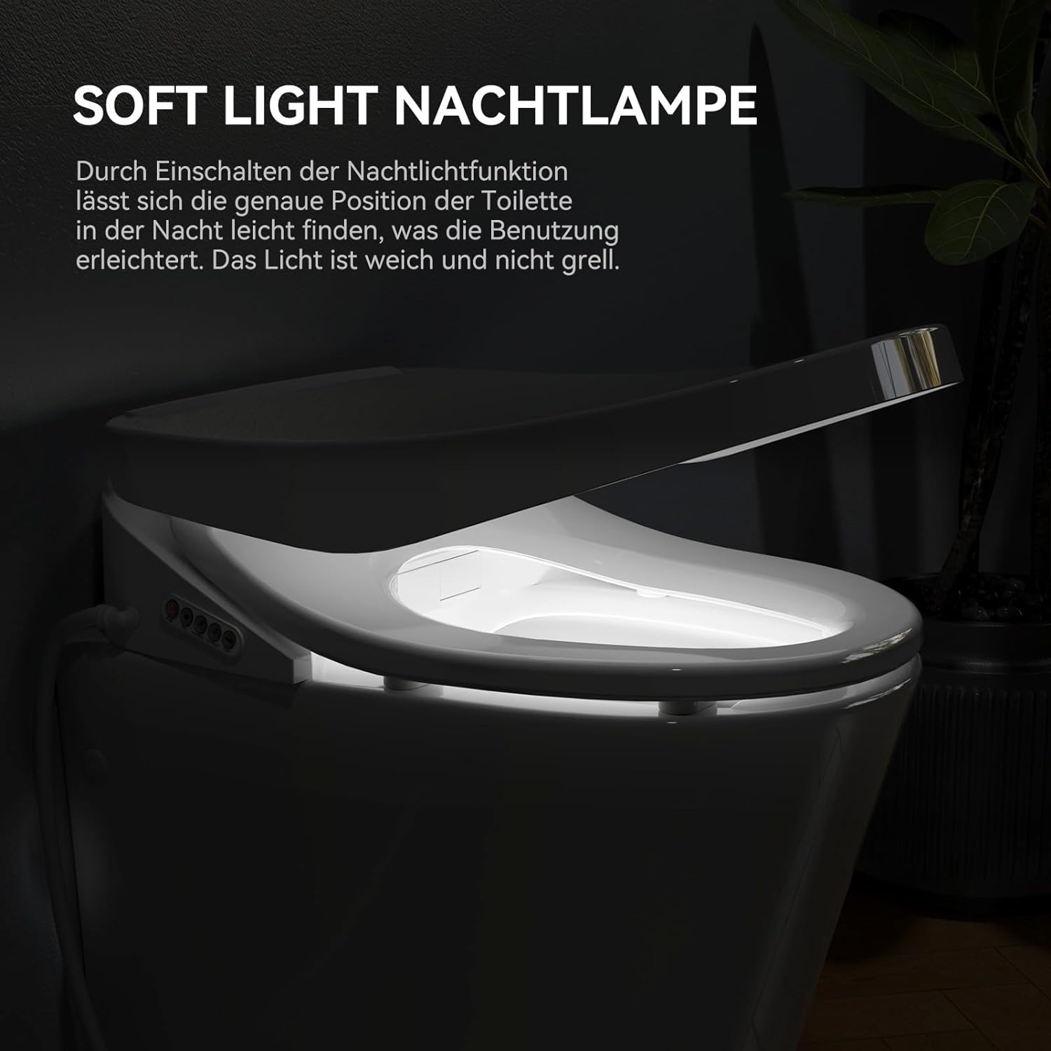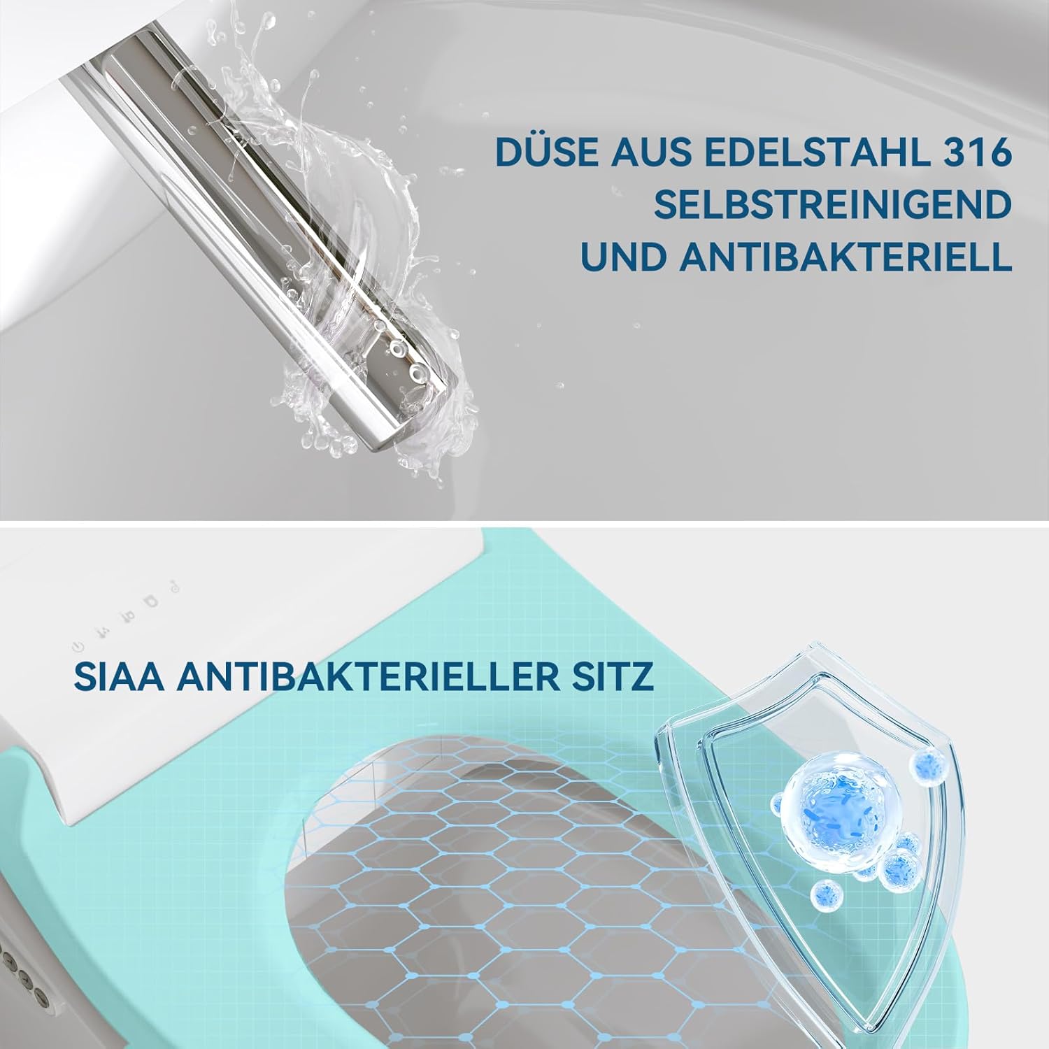 Smart Bidet-Sitz mit antibakterieller Edelstahl-Düse und selbstreinigender Funktion. Reinigung vorne und hinten per Fernbedienung einstellbar.