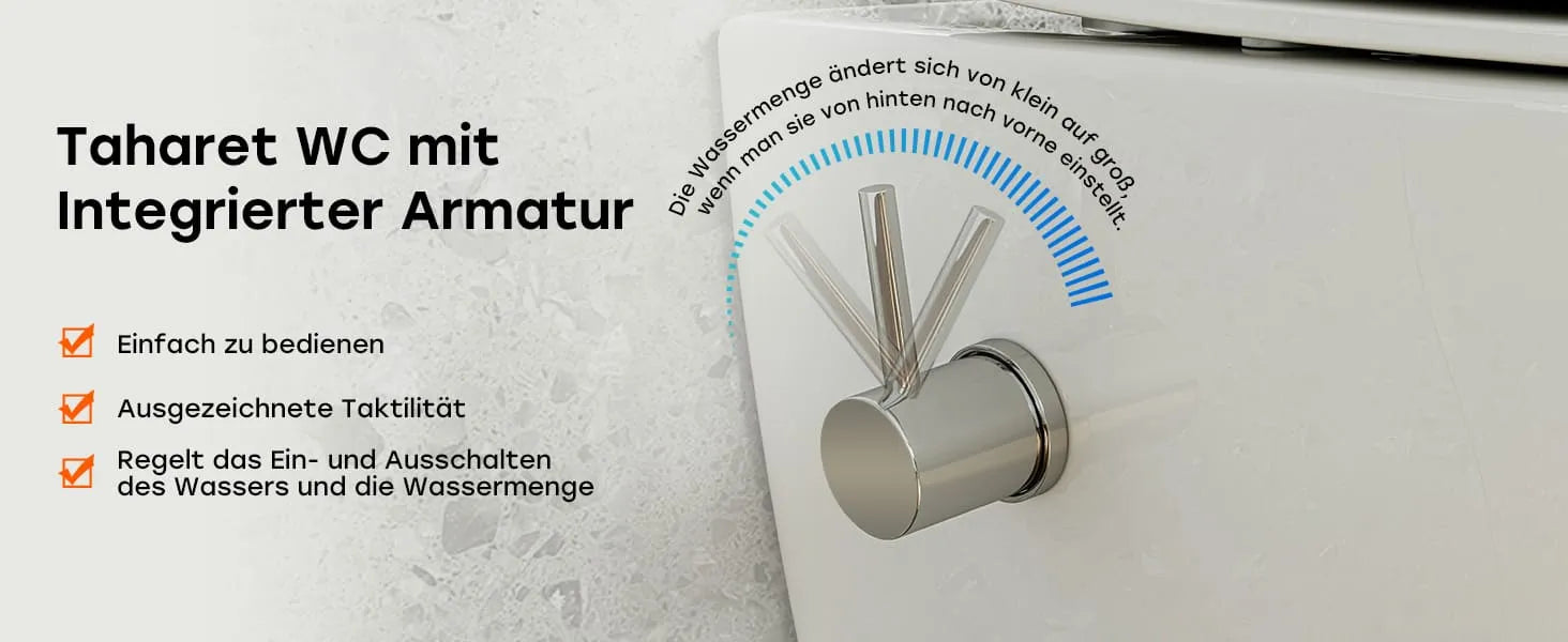 Die Taharet-Toilette ist mit einem seitlichen Steuergriff ausgestattet, mit dem sich Wassermenge und -auslass bequem und präzise regeln lassen. -