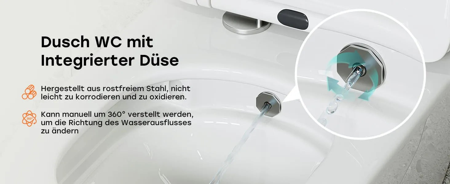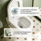 Die manuell verstellbare Edelstahl-Düse lässt sich individuell ausrichten und passt sich so perfekt verschiedenen Reinigungsbedürfnissen an. Korrosions- und oxidationsbeständig für langanhaltende Hygiene. -