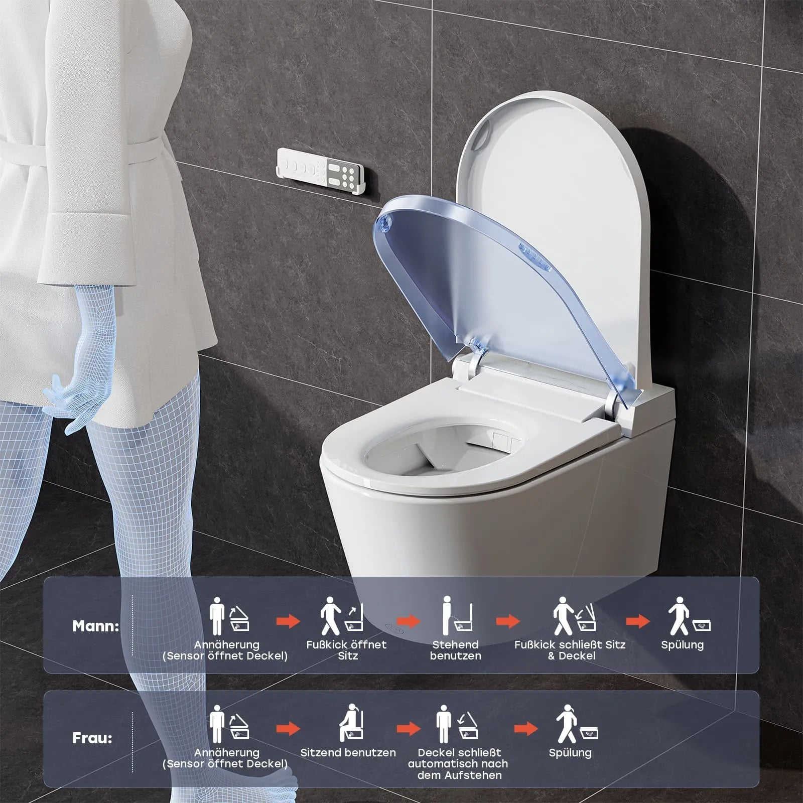 Dank Mikrowellensensor öffnet sich der Deckel automatisch beim Näherkommen. Mit nur einem Knopfdruck läuft der komplette Vorgang – Waschen, Spülen, Trocknen, Schließen – vollautomatisch ab. Ideal für Kinder und Senioren. -