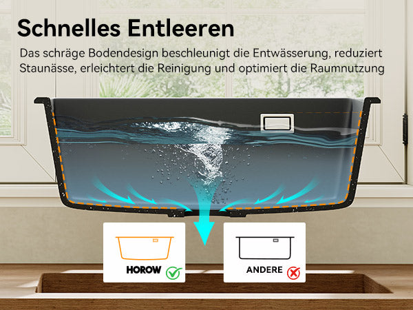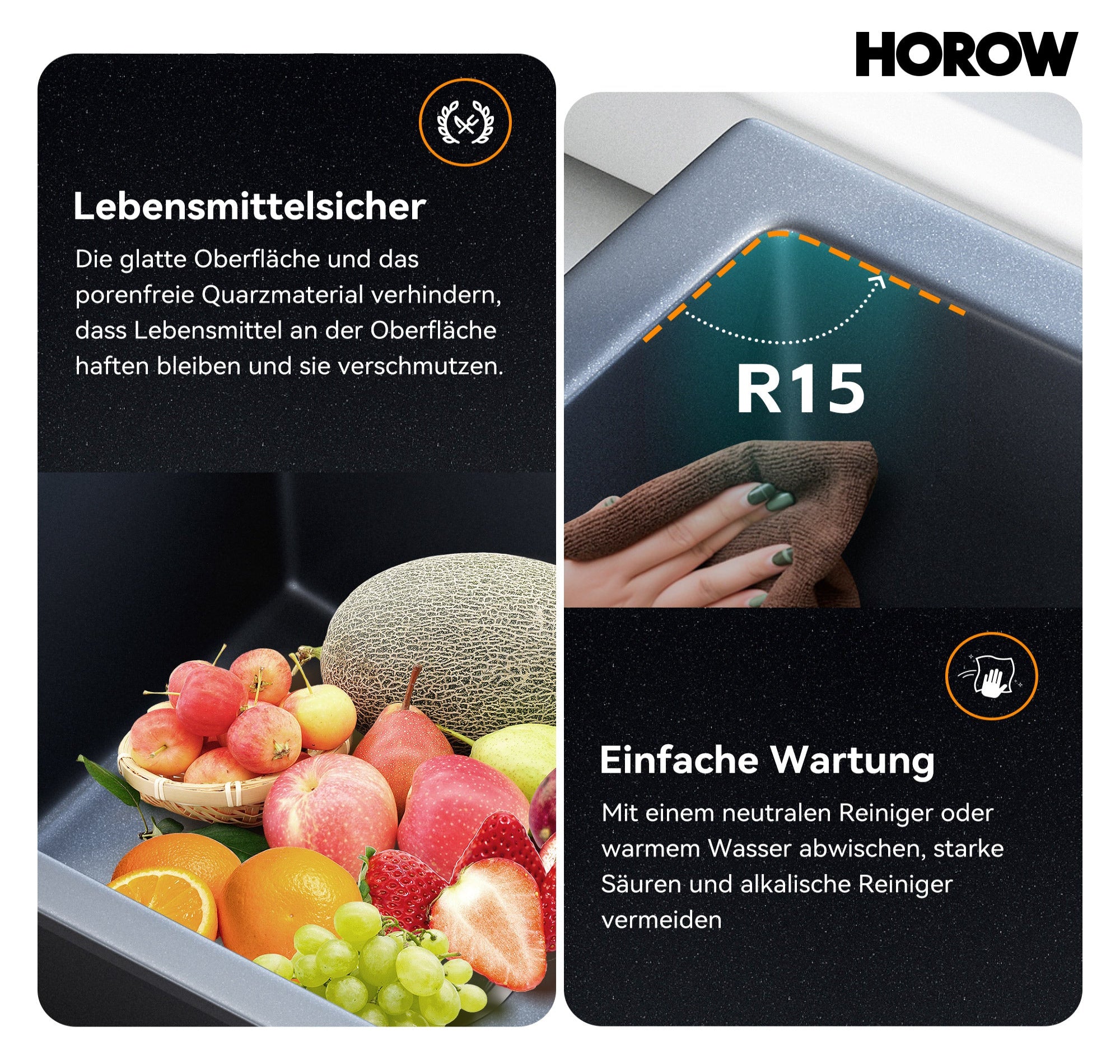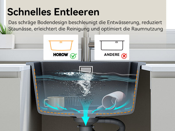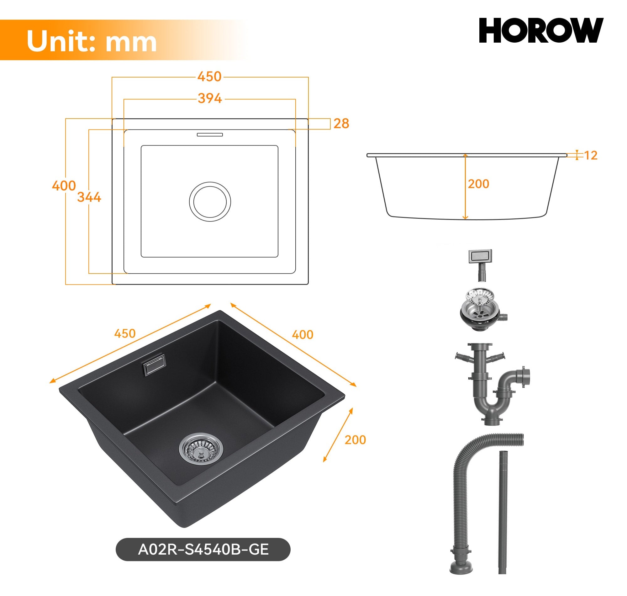 HOROW A09R-S6045W Granitspüle 60 × 45 cm, kratzfest, eckiges Einbauspülbecken09R-S6045W-GE
