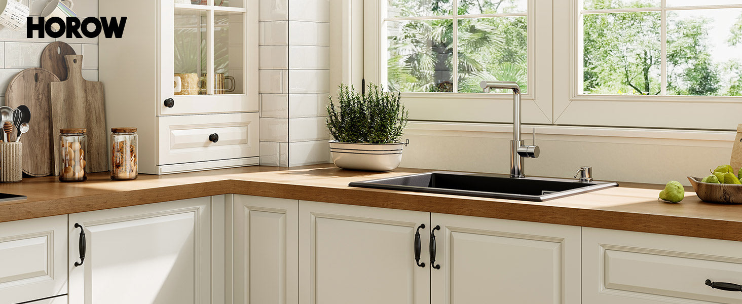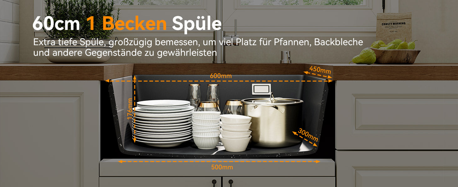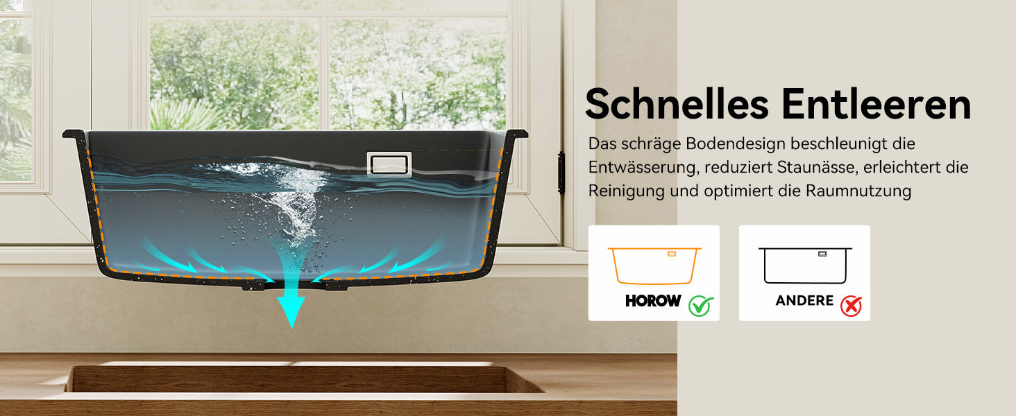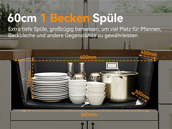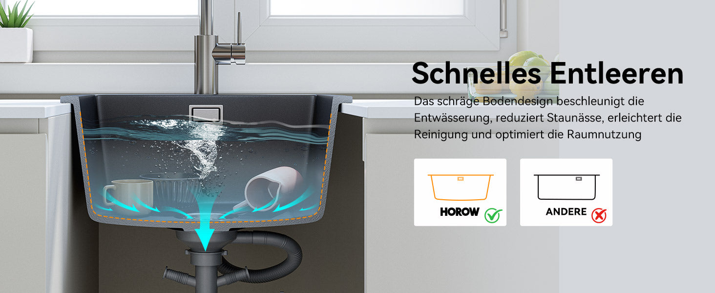 HOROW A09R-S6045W Granitspüle 60 × 45 cm, kratzfest, eckiges Einbauspülbecken09R-S6045W-GE