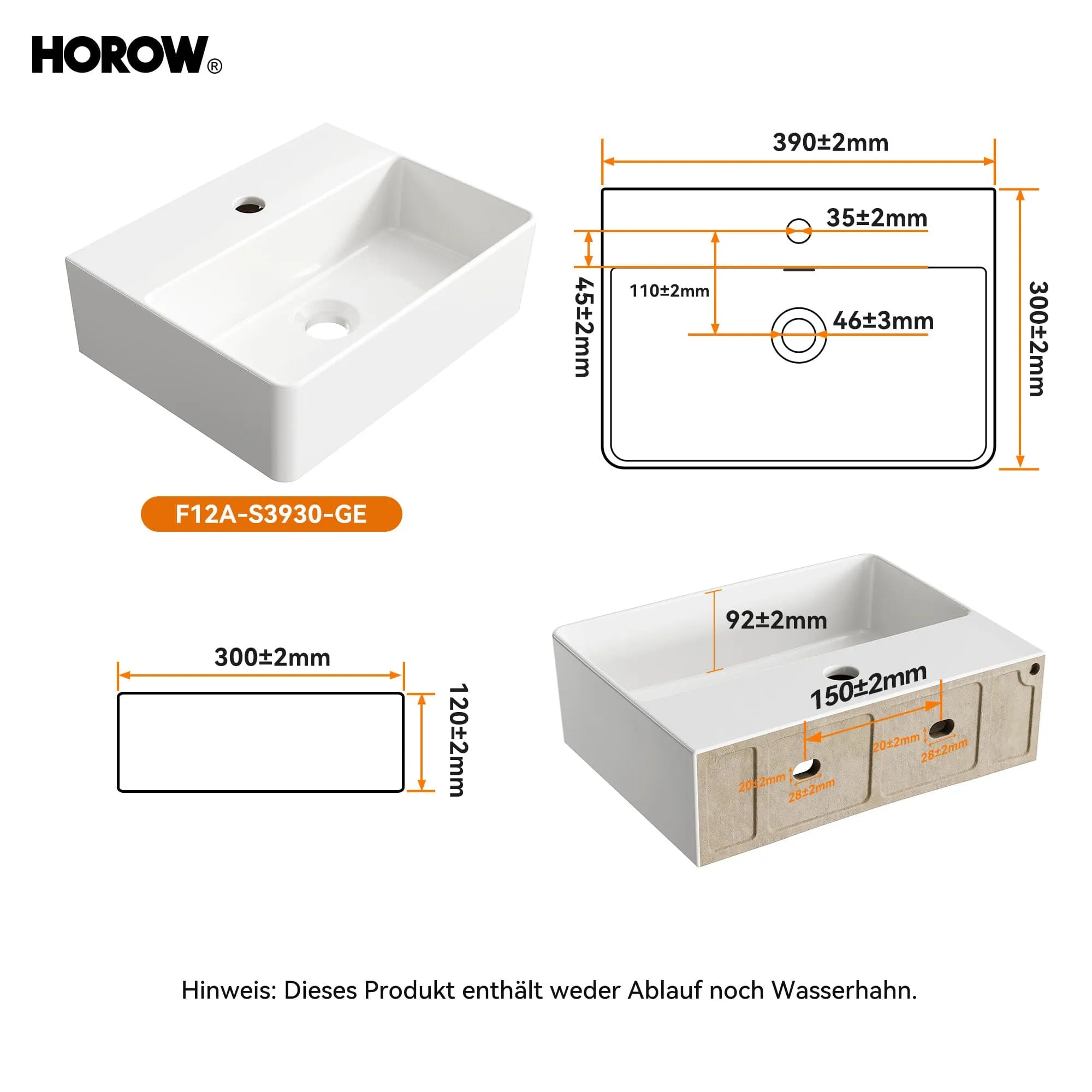 HOROW F12A-S5636 Aufsatzwaschbecken, Hahnloch & Überlauf, 28 cm Lochabstand