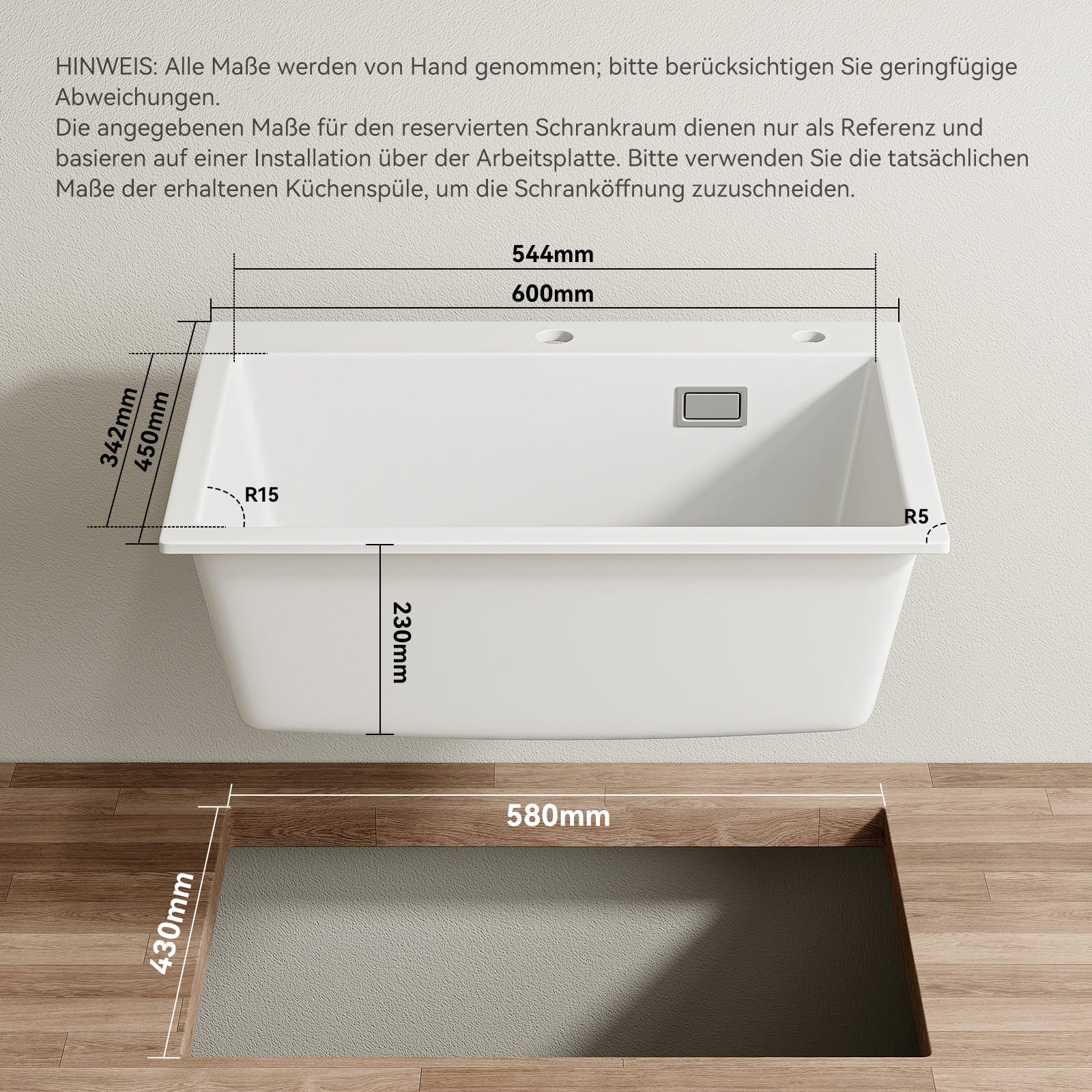HOROW A09R-S6045W Granitspüle 60 × 45 cm, kratzfest, eckiges Einbauspülbecken09R-S6045W-GE