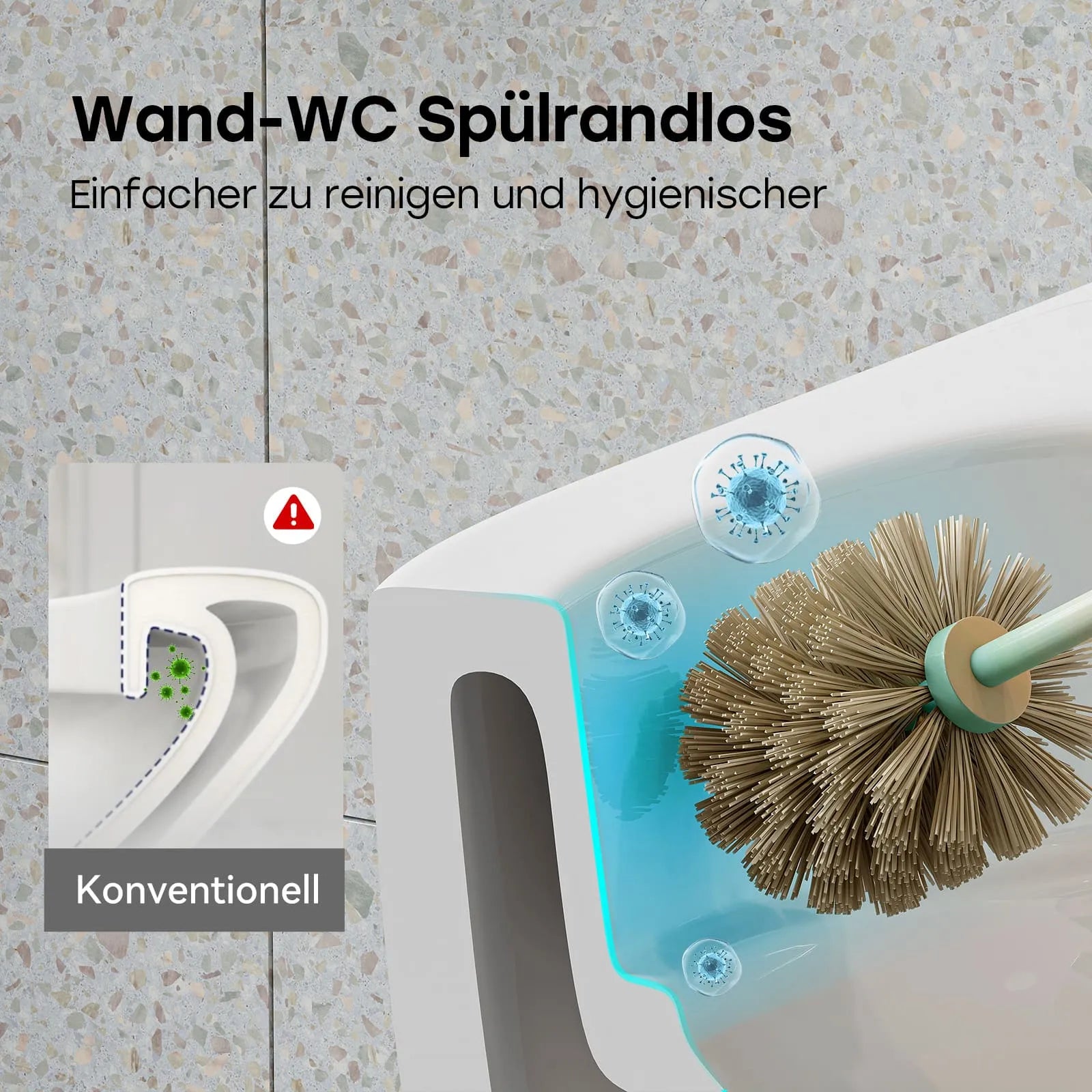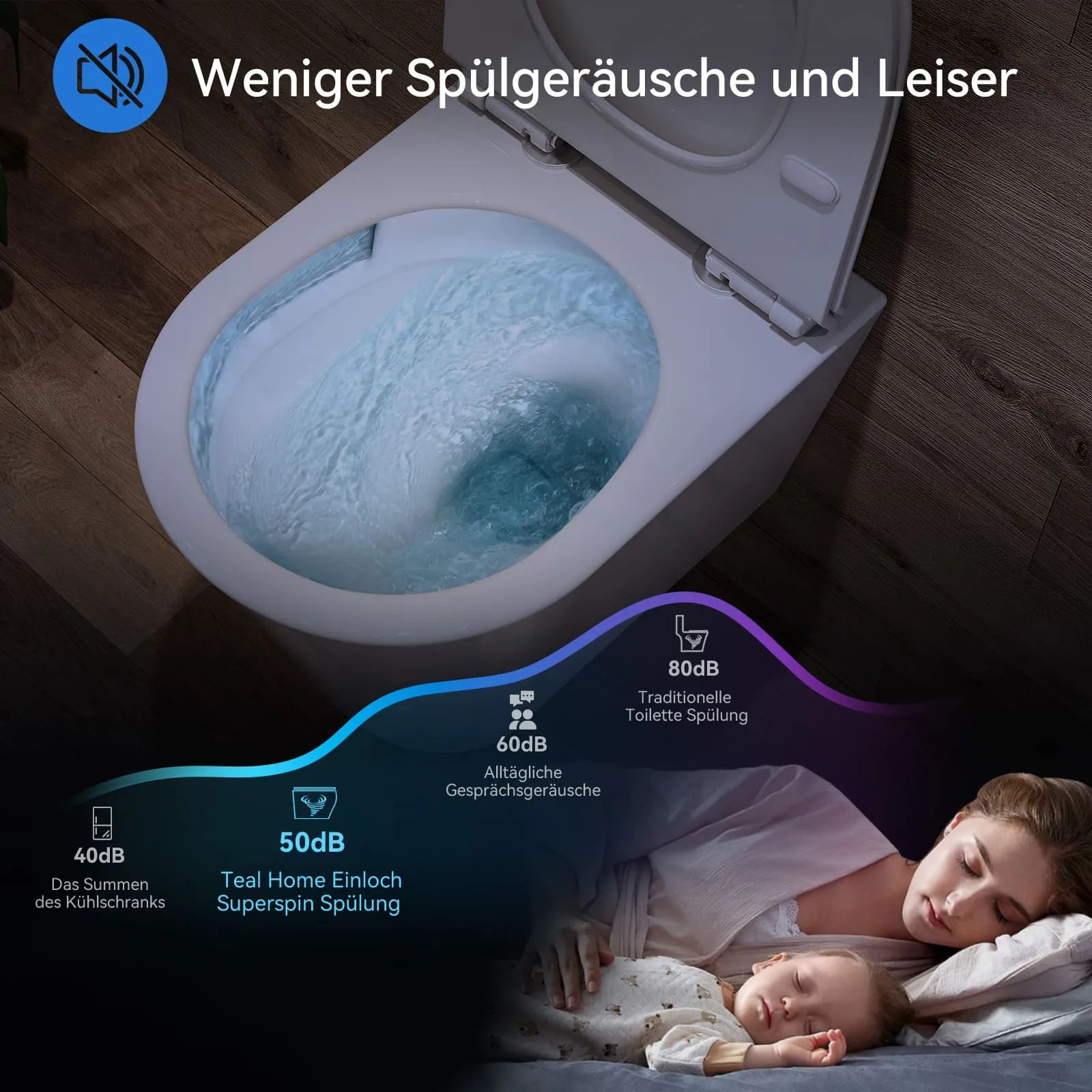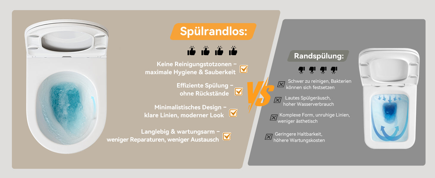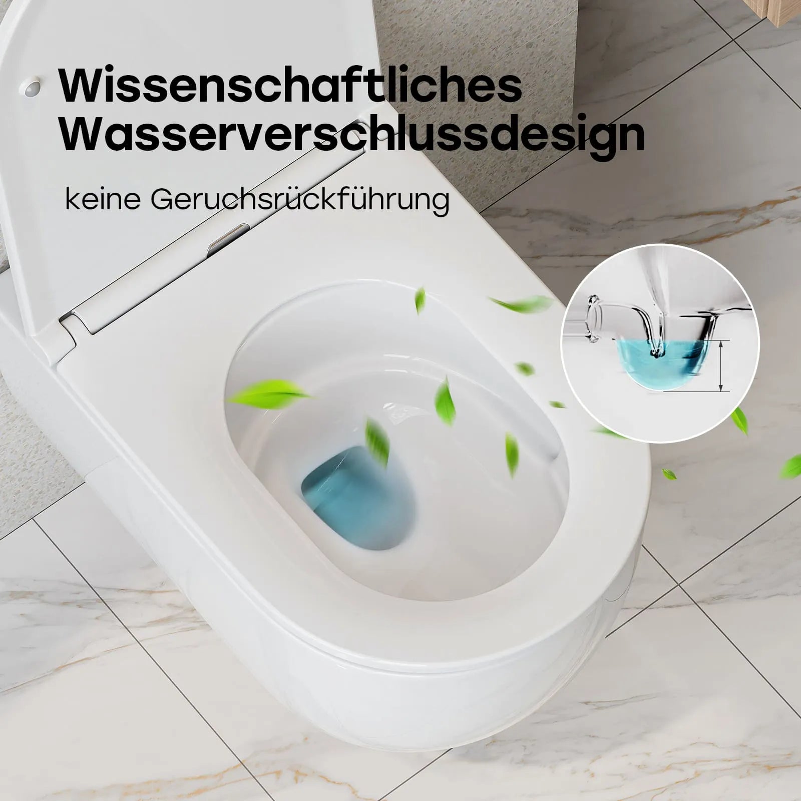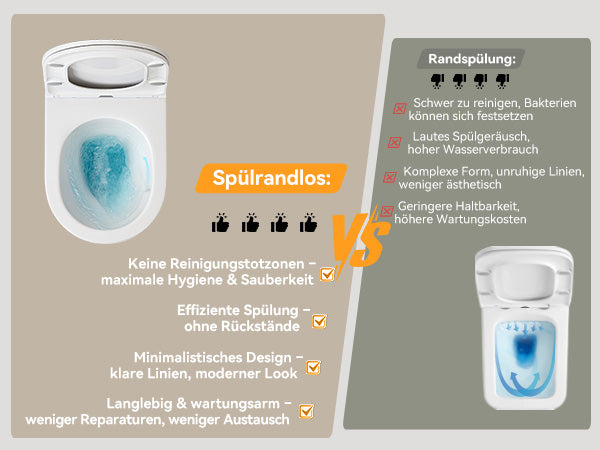 - Spülrandloses Design(Toilette ohne Spülrand): Keine Ecken für Schmutz oder Bakterien. Einfache Reinigung dank glatter, nahtloser Oberfläche. Minimalistisches Design vereint Ästhetik und Hygiene.