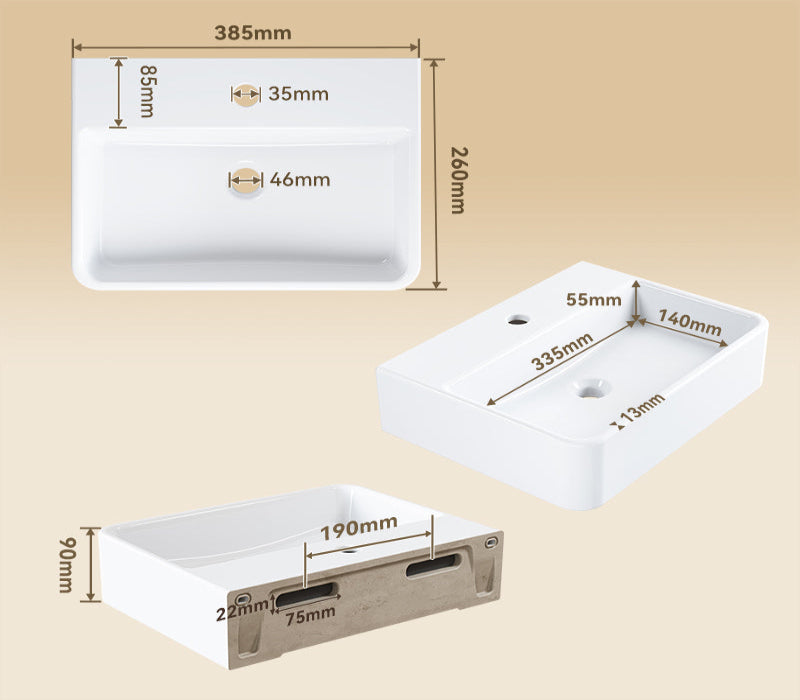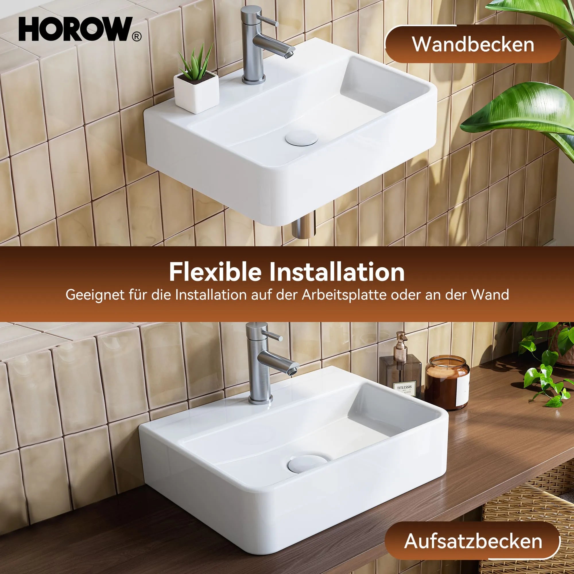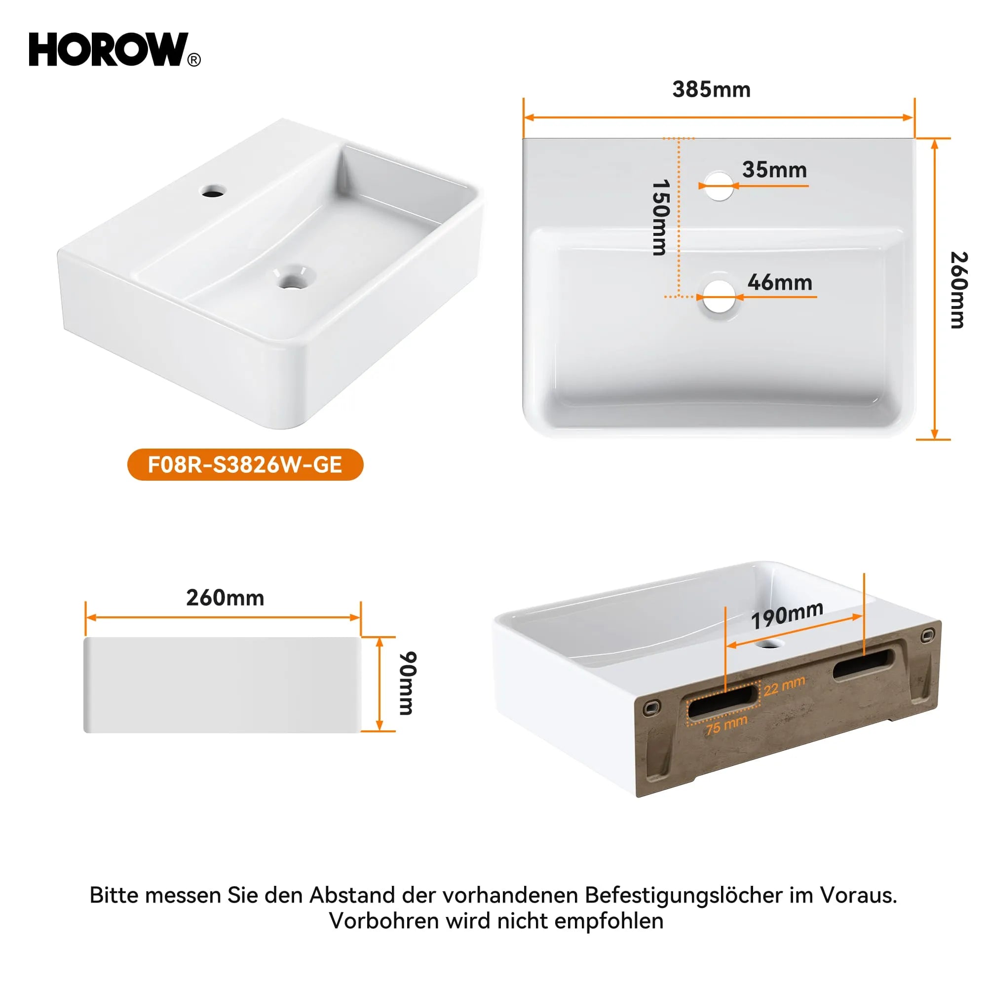 HOROW F08R-S3826W Waschbecken aus Keramik in Weiß, 38×26 cm
