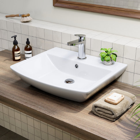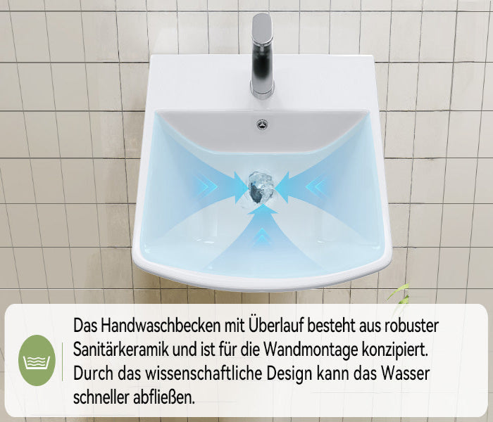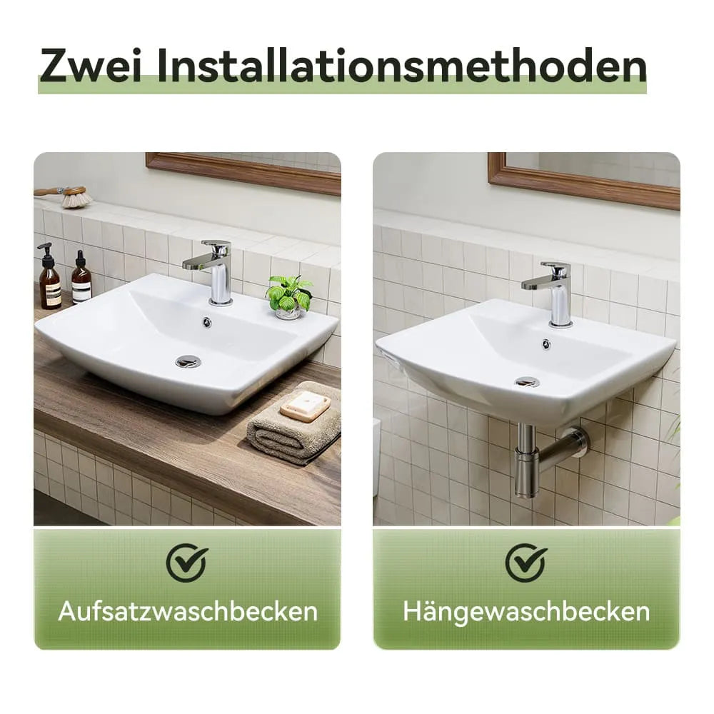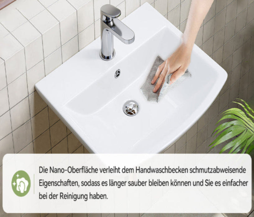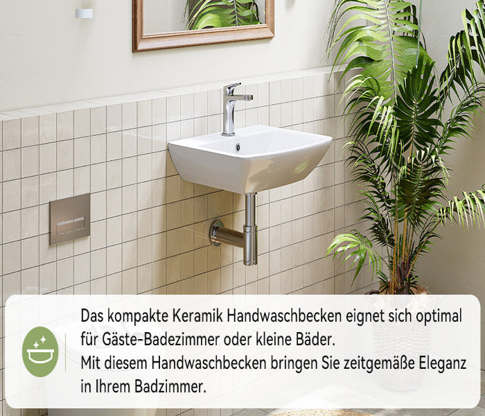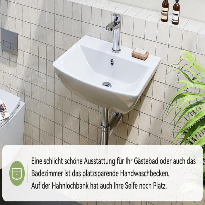 Waschbecken mit abgerundeten Ecken (48×42 cm) – ideal für kleine Bäder und Gäste-WCs, leicht zu reinigen und platzsparend. - Praktische Ablageflächen: