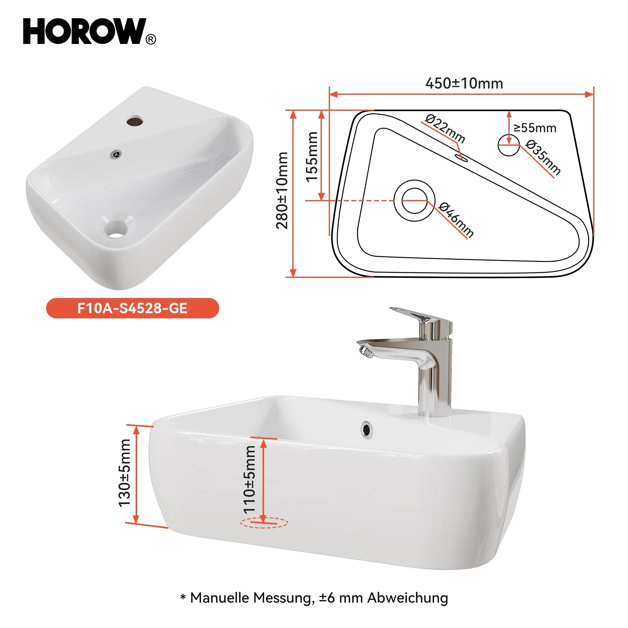 HOROW F10A-S4528 Mini-Handwaschbecken 45 cm, Keramik, Weiß, mit Hahnloch & Überlauf